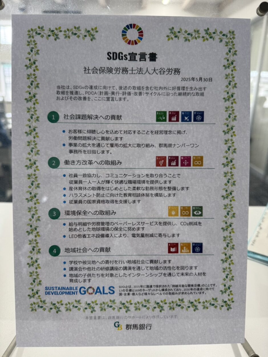 ホームお知らせ SDGs宣言をしました 6月 4, 2025 群馬銀行さんにお手伝いをいただき、SDGっ宣言をさせていただきました。 環境に配慮し、人材を育て、働き方改革を推進し、群馬で一番の売り上げを目指して頑張ります